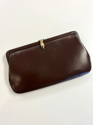 vintage Etra brown leather clutch handbag w/ gloved hand clasp 50s