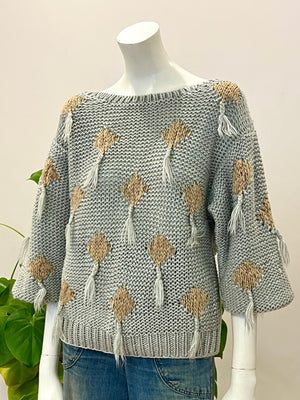 vintage Pure Eclipse dove grey intarsia knit tassel sweater 80s