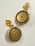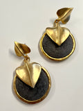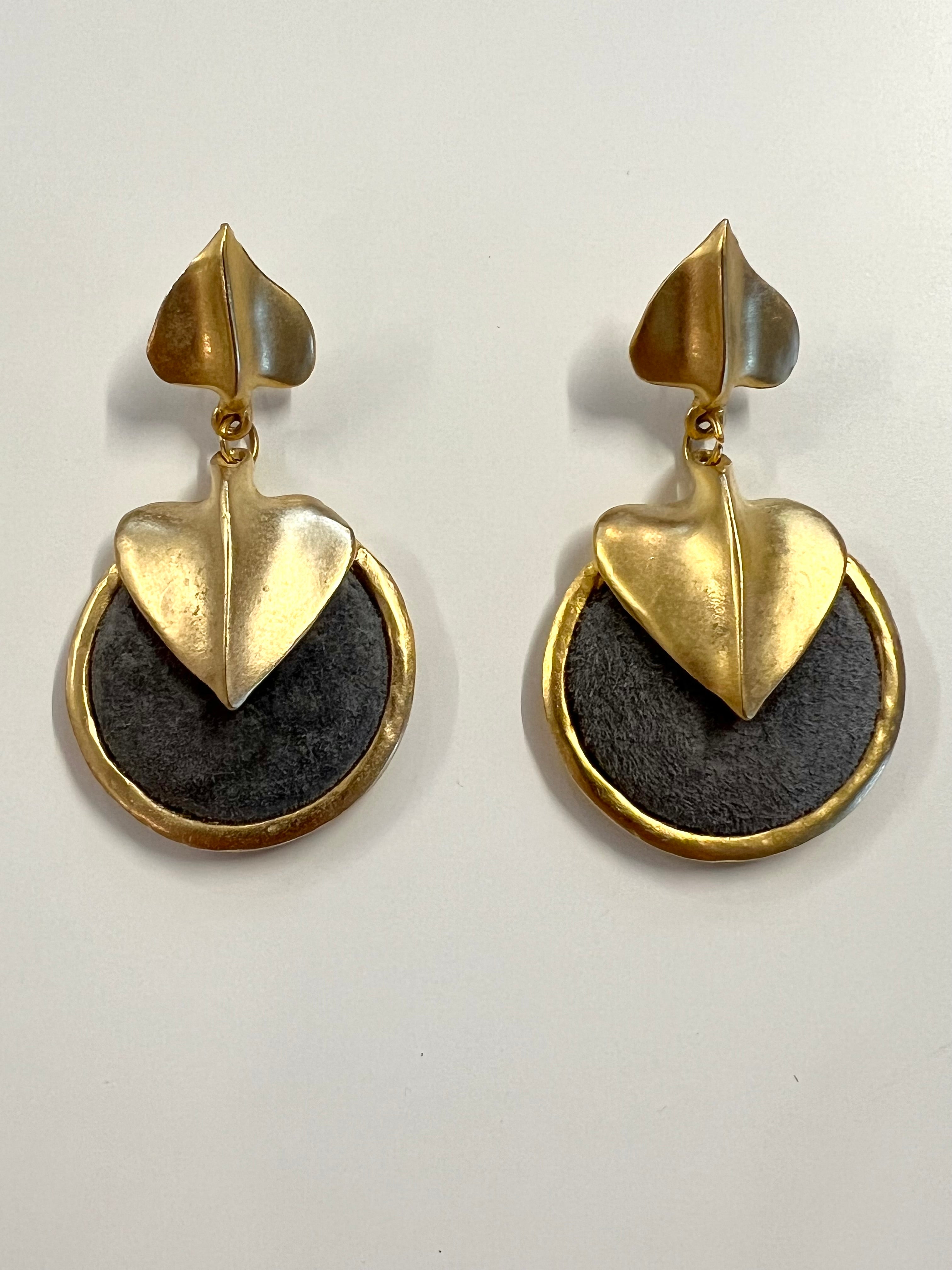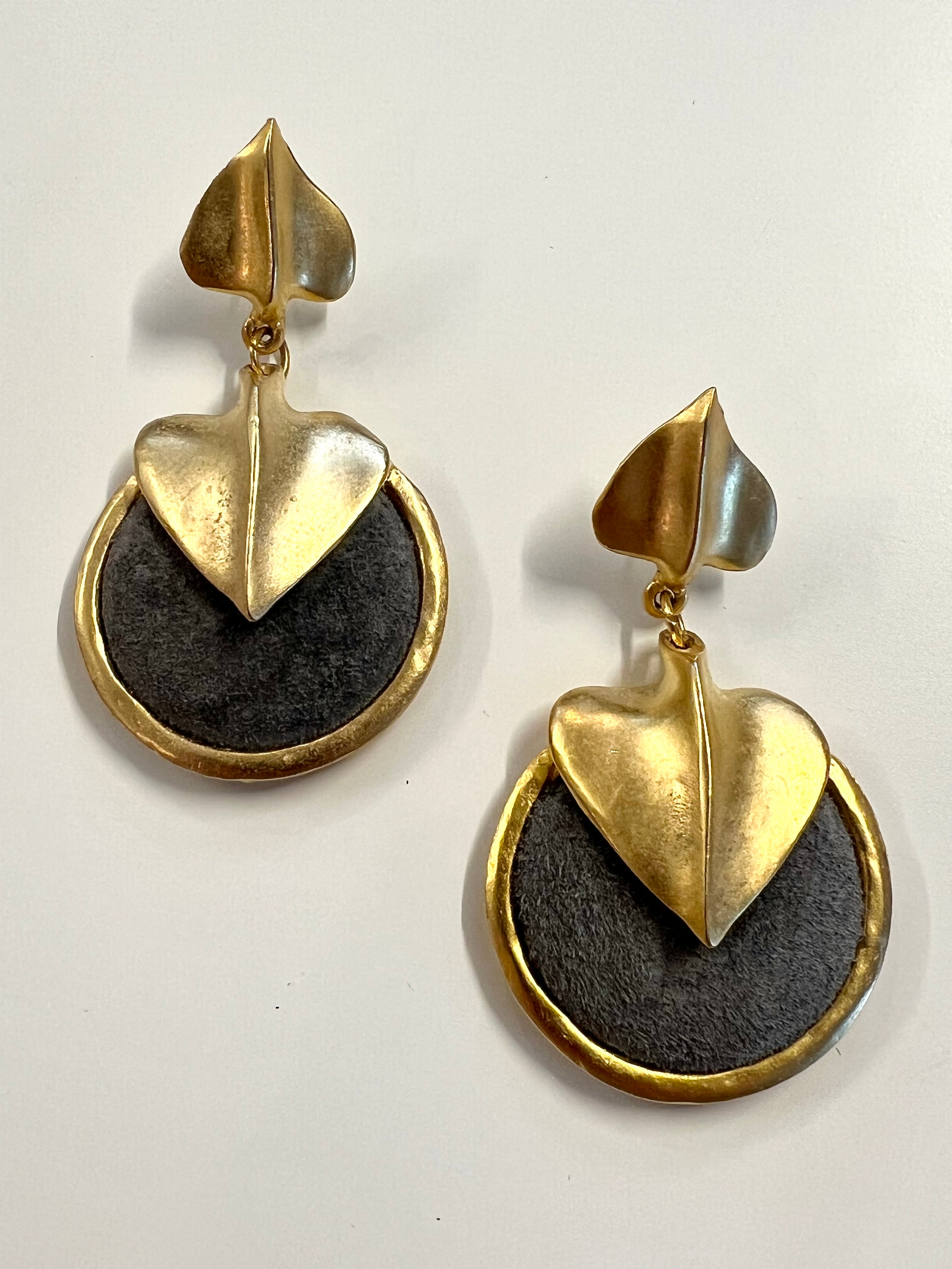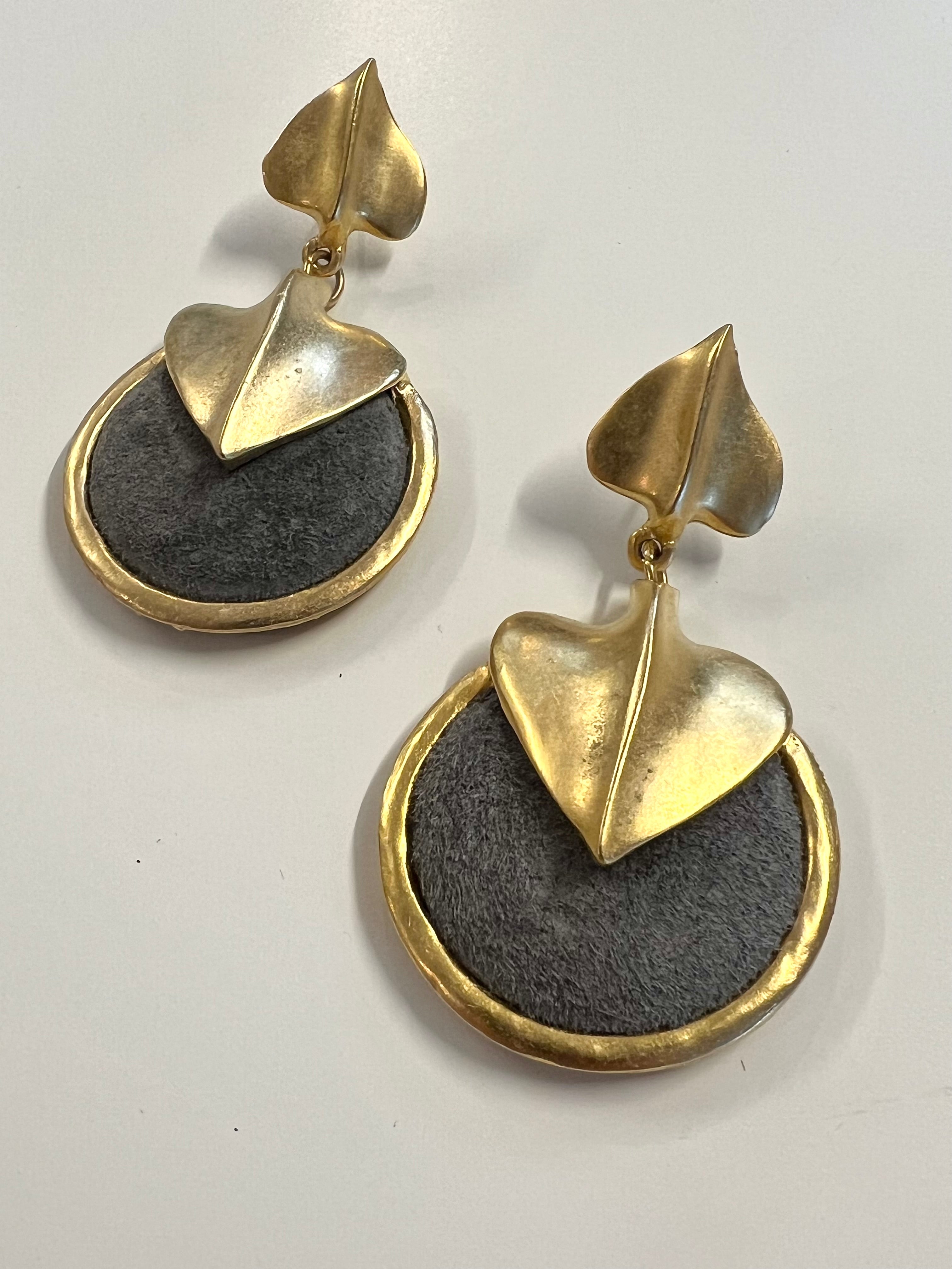 vintage brushed matte gold & soft grey suede button dangle post earrings
