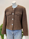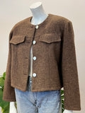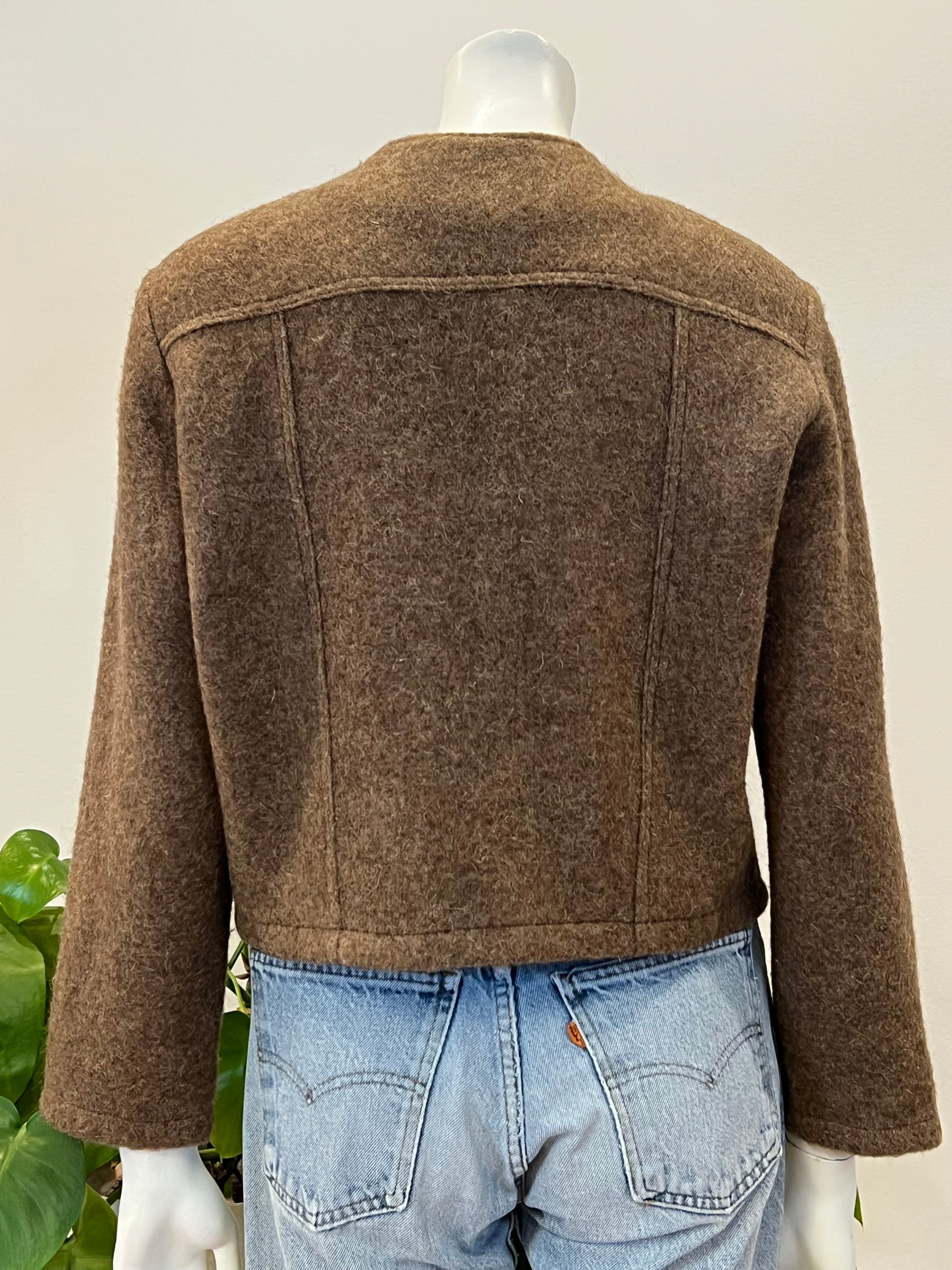 vintage taupe brown mohair wool boxy collarless jacket w/ mother of pearl buttons