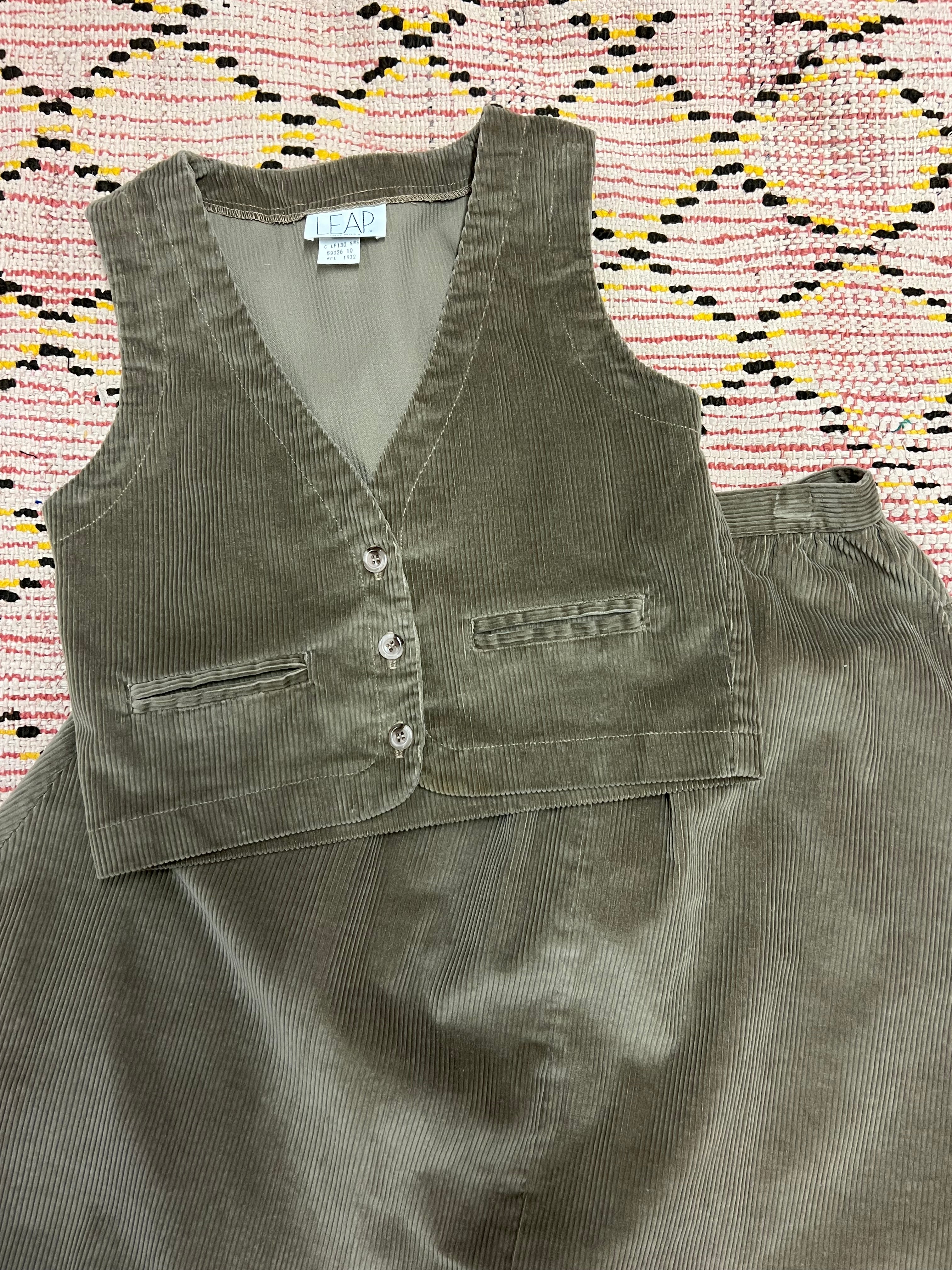 vintage dusty olive wide wale corduroy vest & skirt 2 piece suit